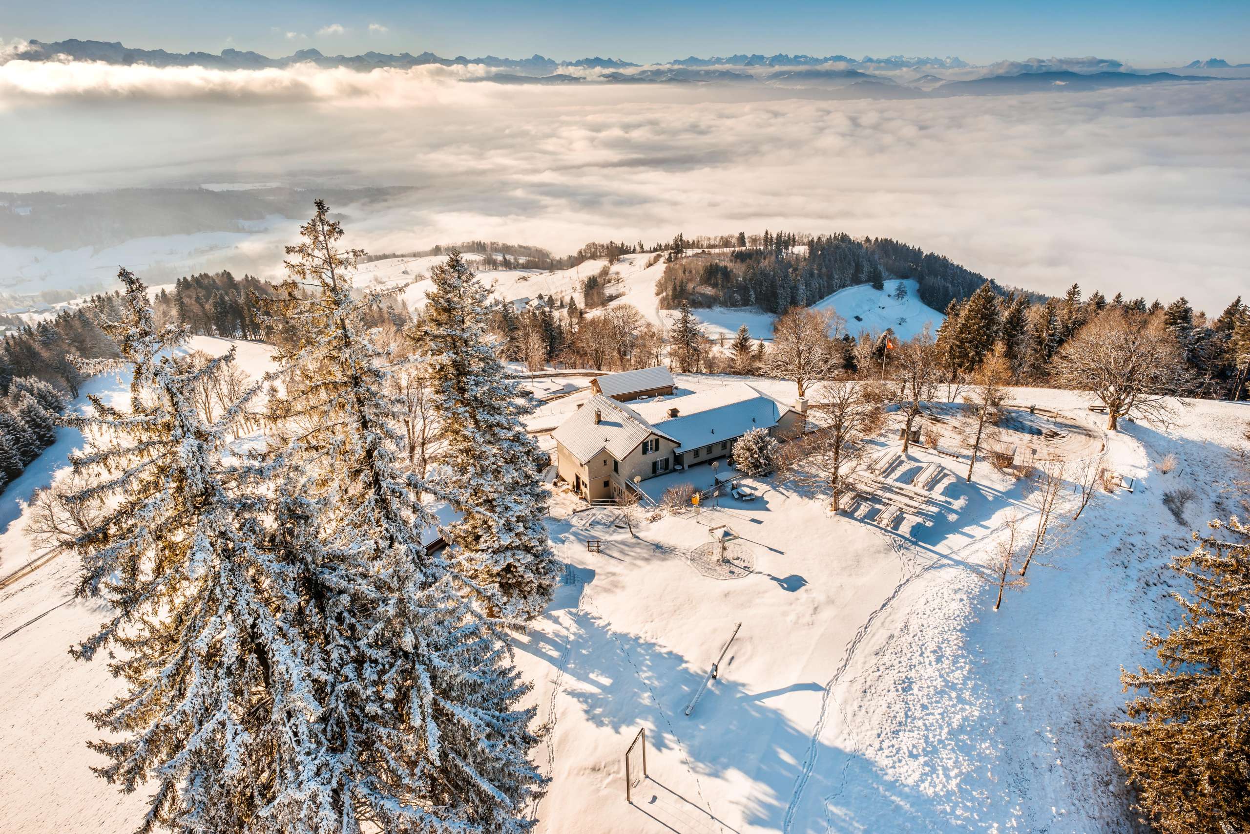 The Bachtel, the beautiful mountain in the Zurich Oberland, combines sledging fun and a magnificent view in winter. The top of the Bachtel can only be reached on foot in around an hour. However, the walk is well worth it and is rewarded with a speedy toboggan run. The first part of the route leads mainly through the forest and is somewhat steeper, while the second part is flatter and is also suitable for children.