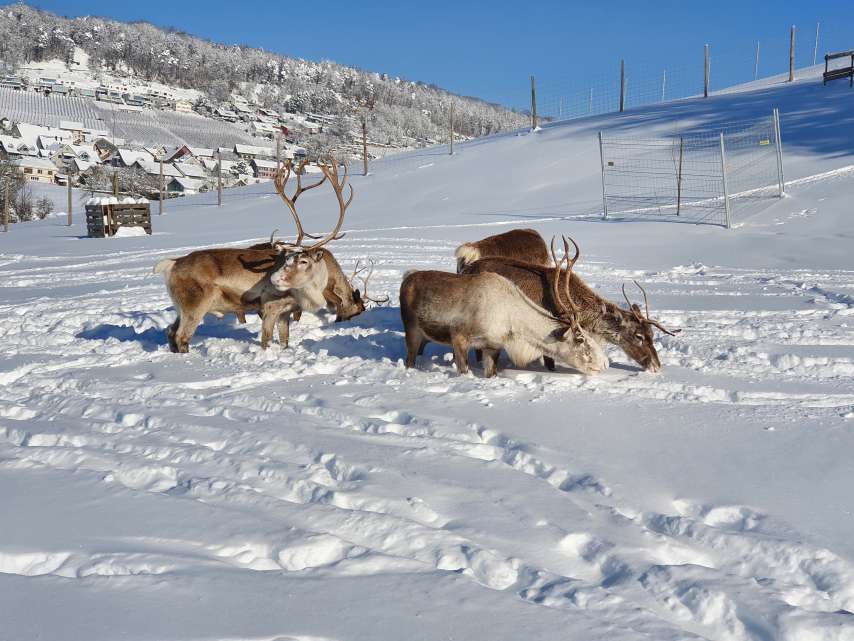 Have you always wanted to get to know Santa's unique helpers better? You have the opportunity to do so on a leisurely walk through the Zurich wine country. The reindeer trekking usually takes place in groups of 6-8 and is suitable for young and old. 17 reindeer live in species-appropriate husbandry on the idyllic farm in Dachsen and are happily waiting for your visit.