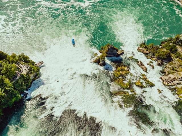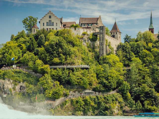 In the middle of it all is a mighty rock. The rock can be reached via a Rhine Falls tour, where you can experience the natural spectacle up close. You can also stand almost in the middle of the waterfall on the platforms built partly over the Rhine.